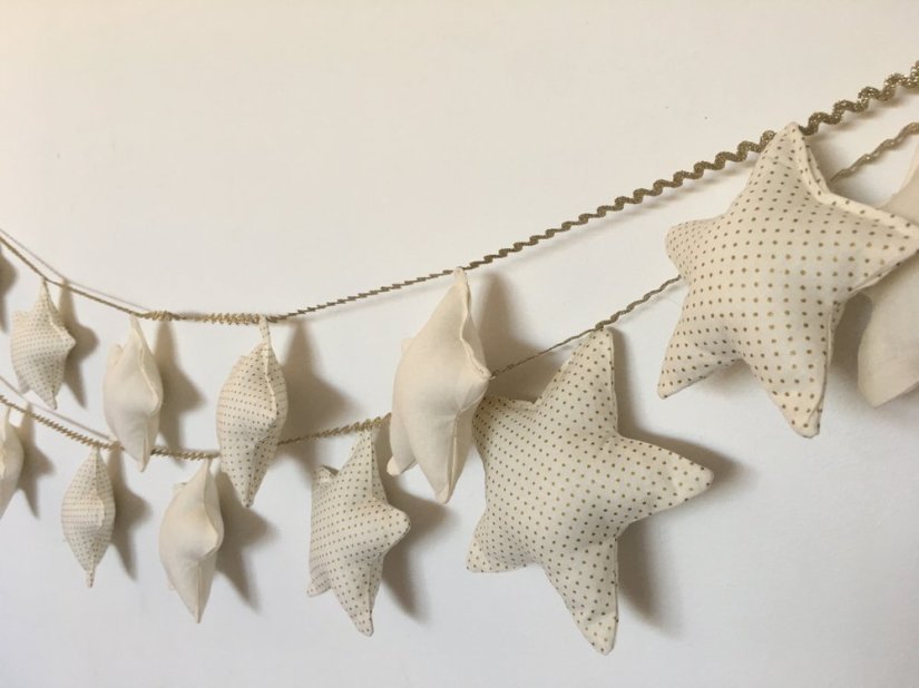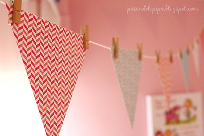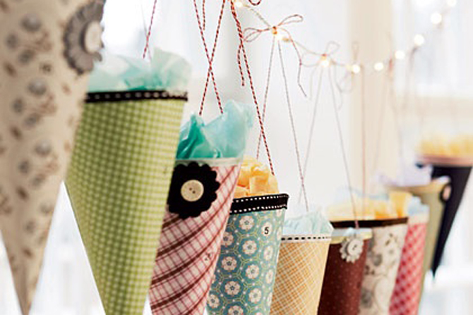 - Una guirnalda hecha con conos de cartón. Puede decorarse con trozos de washi-tape, botones, papel seda … Esta guirnalda puede servir, al mismo tiempo, como piñata, ya que puede meterse en los conos alguna golosina e invitar a los niños a coger uno cuando termine el evento