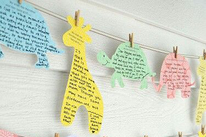 - Guirnalda de buenos deseos. Servirá para que tu hijo guarde un precioso recuerdo de su fiesta. Se recortan siluetas de animales u otros motivos en folios de diferentes colores y se cuelgan de un cordel con ayuda de pequeñas pinzas de madera. Después, se anima a los invitados a que escriban el mensaje que quieran para tu hijo. Cuando acabe la fiesta se podrá leer las palabras de afecto de todos.
